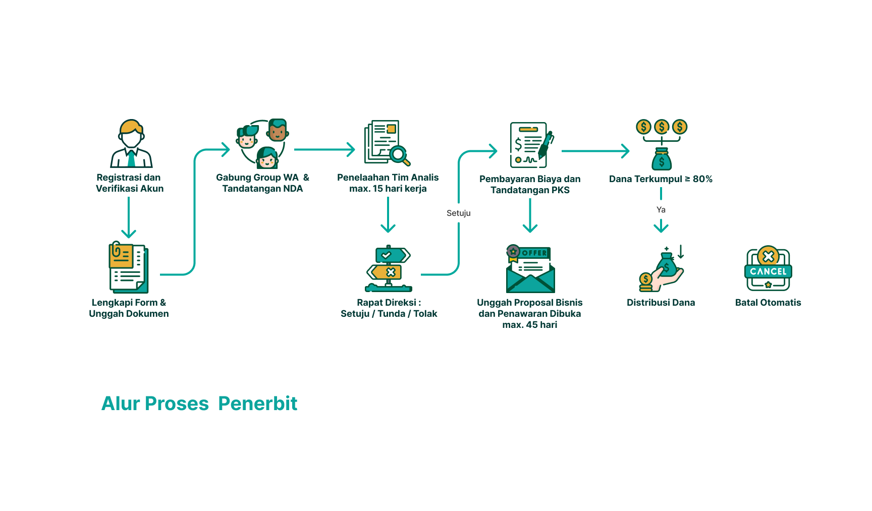 Penerbit dapat mengajukan proyek usaha yang produktif dan sesuai prinsip syariah melalui proses seleksi yang transparan. Setiap tahapan dirancang untuk memastikan kelayakan, kehalalan, dan keberlanjutan bisnis sebelum ditawarkan kepada para Pemodal.